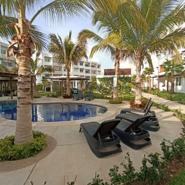 Áreas de esparcimiento con palapas y alberca con chapoteadero