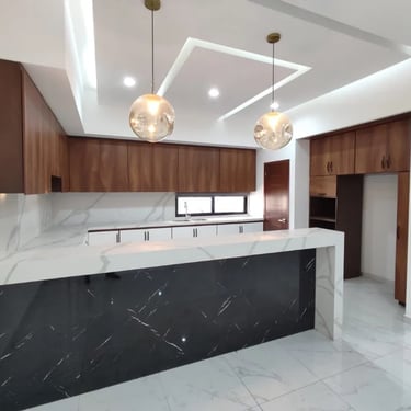 Cocina en madera con isla y cubierta de granito, con alacena amplia