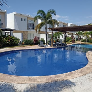 Privada con alberca semitechada, terraza para eventos con palapa de palma, baños y mobiliario. Área de juegos infantiles con terraza piñatera, acceso controlado con interfón y seguridad 24/7.