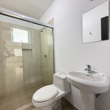 4 baños completos con canceles de cristal templado y muebles en lavamanos